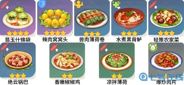 2.【烹饪】翡玉什锦袋、辣肉窝窝头、兽肉薄荷卷、水煮黑背鲈、轻策农家菜、绝云锅巴、香嫩椒椒鸡、凉拌薄荷、爆炒肉片烹饪材料。