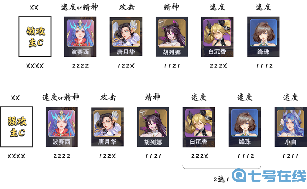 在搭配强攻系主c时,我们可将降珠和白沉香中的一位替换为小白,因为小白的很多技能都和强攻系魂师有绑定的关系,所以小白在针对强攻系魂师的增伤上也有更强的匹配度,只不过因为目前强攻系魂师的普遍疲弱处境,如果大家有唐晨的话,就不用考虑强攻系搭配祝福流了,如果没有唐晨的话倒是可以一试。
