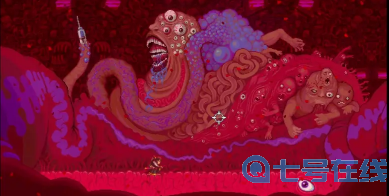3阶段分成四个色彩的小屏幕时,只需要关注一个屏幕,并操控主角把它们砍完就行。4阶段四个色彩会重叠在一起,玩家需要找到蓝色的影子,操控它砍掉所有的蓝色的眼睛。5阶段鼠标会上下颠倒,玩家需要注意。6阶段玩家的鼠标准星和主角都会产生残影,污染视野,需要在屏幕的一侧开始清理,不要乱晃鼠标,遗漏目标。四阶段boss会将玩家拉入它的精神世界,boss将使用针管、会发射小球的肉球、肉柱来攻击玩家。