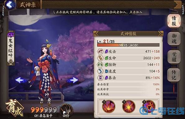 3、死亡之舞:全体敌人132%伤害,觉醒后,30%+效果命中,使得对方被红枫娃娃附身。因为附身后死亡会附加伤害,运气好全附身了,可以一口气秒了对面所有人。