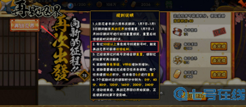 1、在游戏中再战忍界是需要解锁条件的,它的解锁条件是:需要此账号中有过50级以上的区服账号,并且重建新区号时才会触发再战忍界活动,比如你当前新区建的这个号里面,最高的账号等级才49级那就不会触发再战忍界。