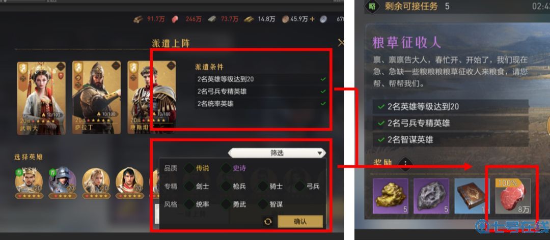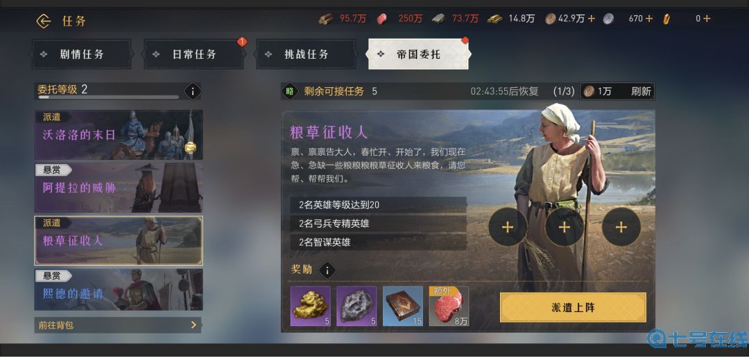 需要派遣指定数量英雄完成委托。任务条件通常包括英雄等级、战斗风格和兵种专精。任务条件满足得越好,获得额外奖励的概率就越高。额外奖励除了铜币、食物和木材等生产物资,更有行动令、科技加速和训练加速等珍贵道具。完成橙色高品质任务,还有机会获得橙色英雄或技能哦~