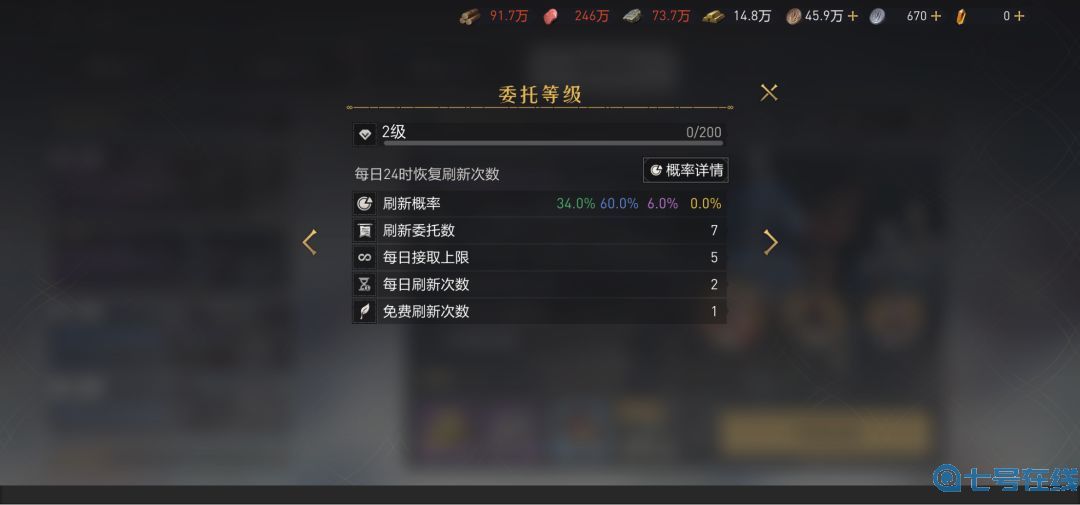 2.完成委托任务获得委托经验,可提升委托等级。委托等级越高,任务品质、任务刷新数量和可接取任务上限就越高。