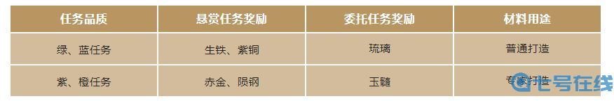 委托任务可分为派遣任务和悬赏任务。它们对应获得的打造材料也各不相同,如下表所示。领主可根据目标挂饰的材料需求,合理筹划任务类型的选择。