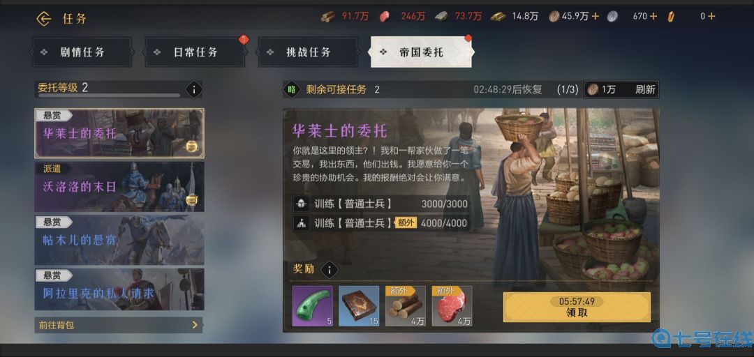 打造挂饰需要的任务材料,主要通过帝国委托任务获得。升级城镇中心至14级后,可解锁主界面左侧任务系统的帝国委托。