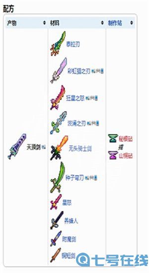 1、合成配方:虹猫之刃、泰拉刃、狂星之怒、波涌之刃、无头骑士剑、种子弯刀、星怒、养蜂人、附魔剑、同志短剑