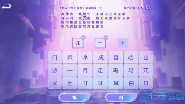 从给出的文字池中,选择2~3个字,进行“合”或“拆”的操作,拼组成上方歌词段落中的文字,即找到彩蛋。