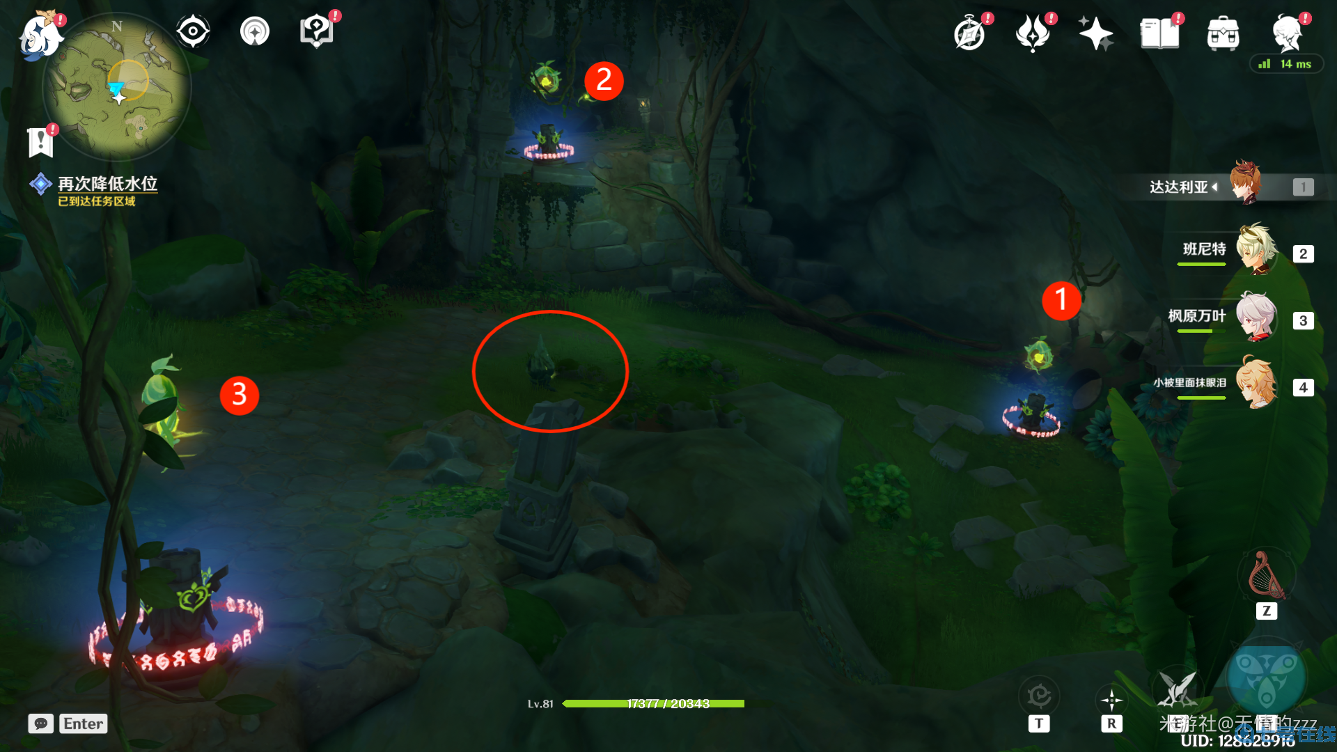 PS:要是跳的不够高,用雷元素刺激蘑菇就行/或者爬墙也能碰到仙灵。