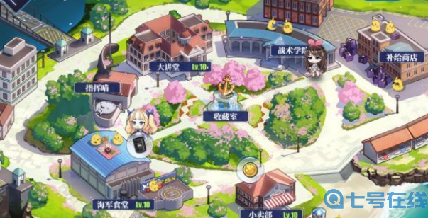 游戏中学院建筑有大讲堂、补给商店、小卖部、海军食堂、战术学院。