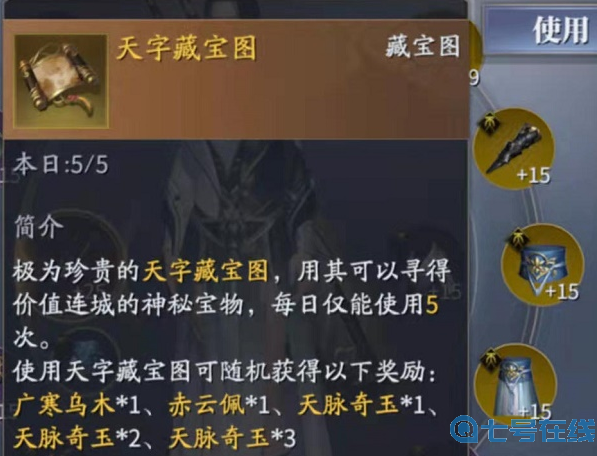 1、天字藏宝图是高级宝藏,玩家可以通过人字藏宝图的宝箱、神庙使者、惩凶等活动中概率获取
