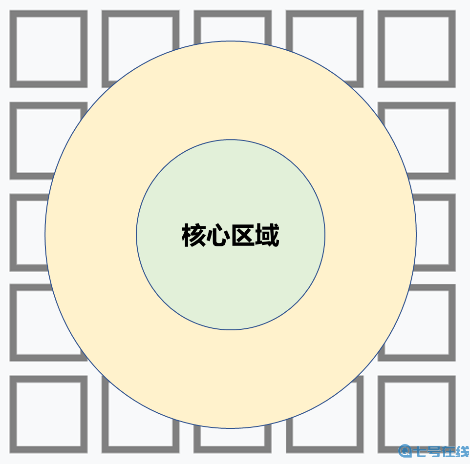 先聊一下爆炸的细节问题:爆炸半径是2格范围,影响着超过9格的敌人。其中爆炸中心是一个半径1.1格的圆形,位于其中过的敌人会受到额外伤害。这里用一张图来大致演示一下范围: