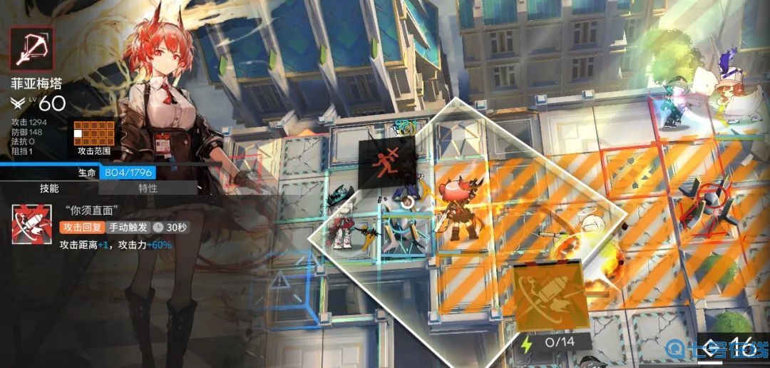 实战中,我们要放大一技能“你须直面”的最大亮点:利用更广阔的攻击距离,对敌人实施远程打击。远达身前五排的攻击范围,能让菲亚梅塔触及到其他狙击所不能的位置。俗话说“一寸长、一寸强”,在她的身上得以体现。