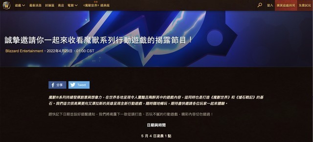 暴雪官宣:《魔兽》手游5月4日凌晨直播,将公布最新进展 2022-04-29